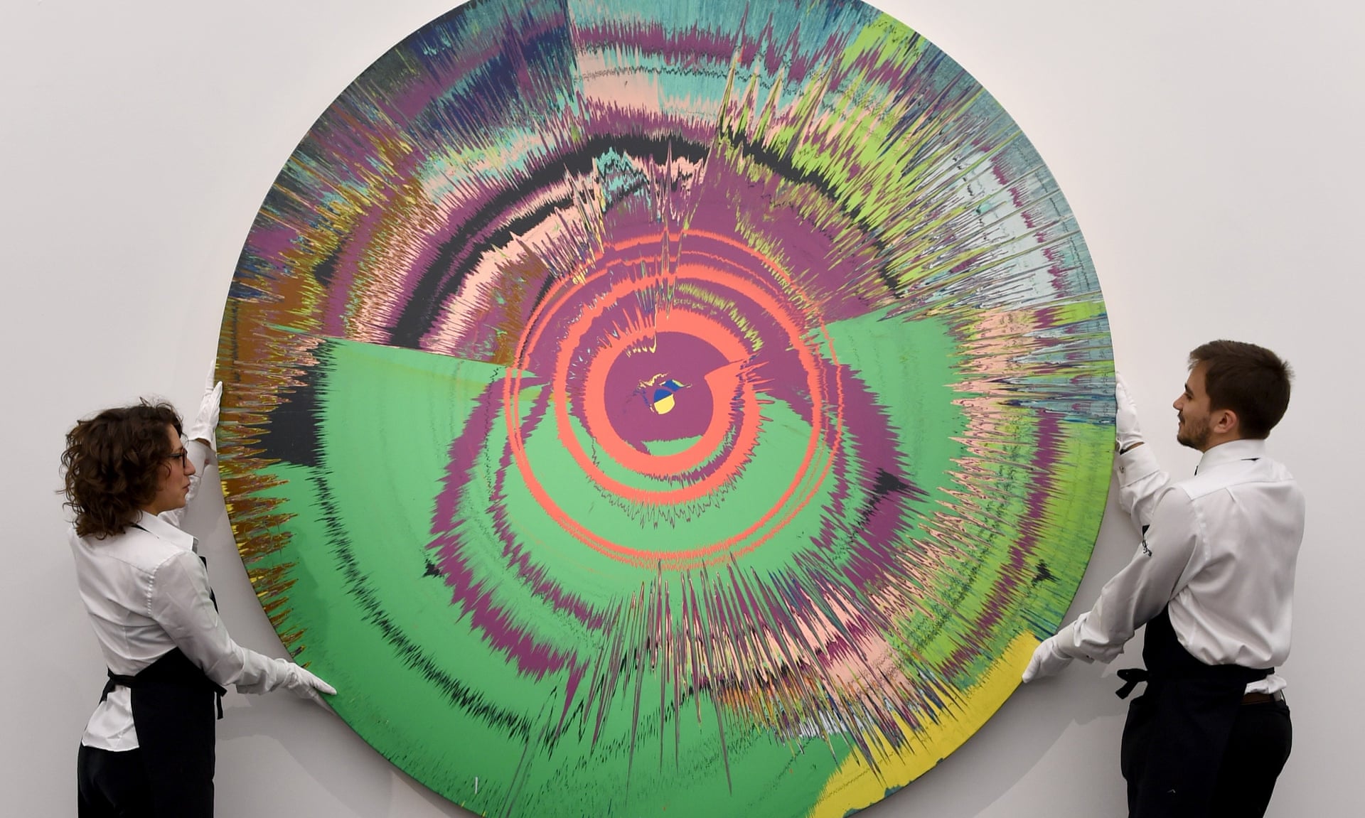 ●Beautiful, Hallo, Space-Boy Painting’ by Damien Hirst with David Bowie. Photograph: Anadolu Agency/Getty Images