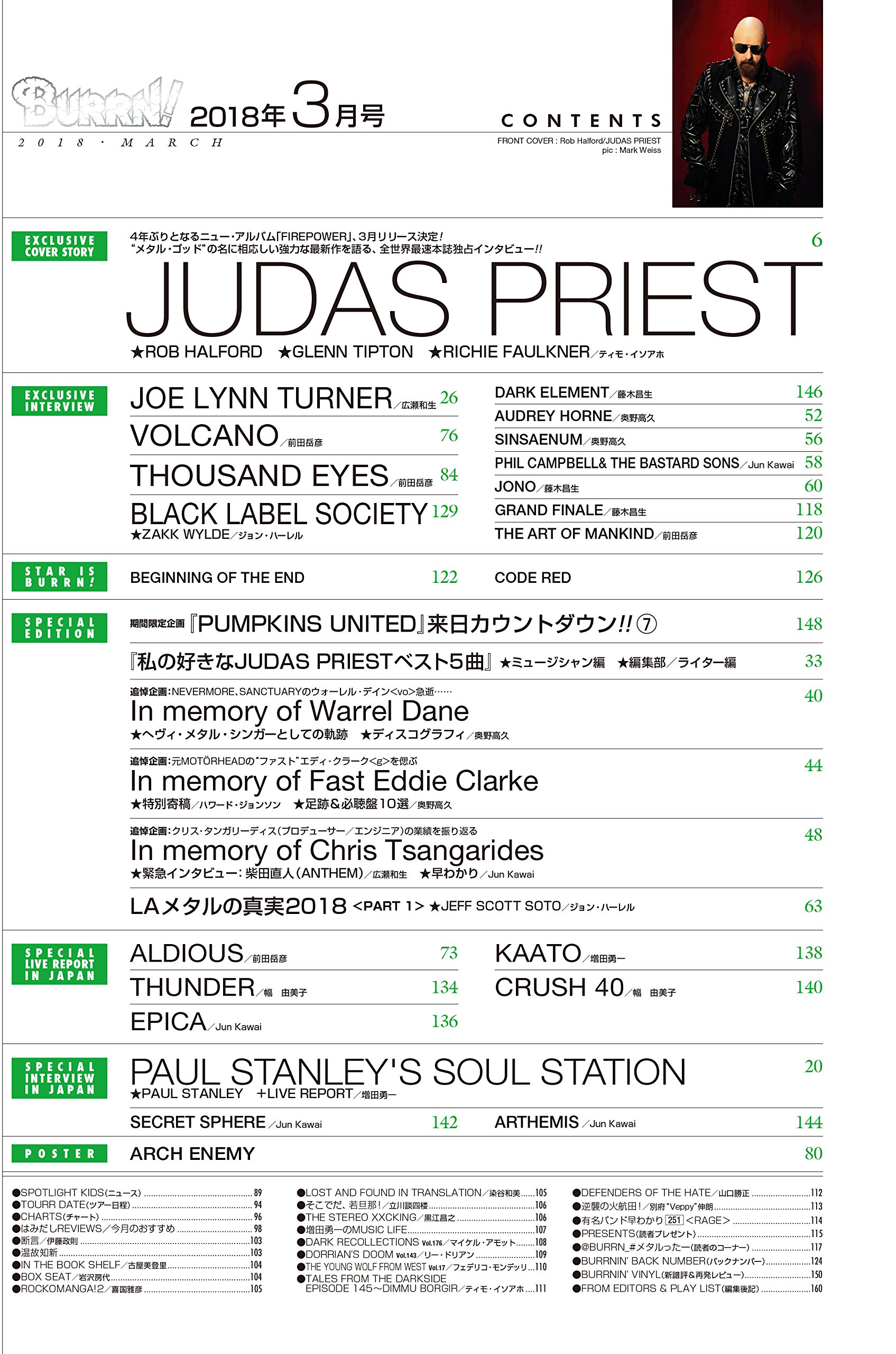 ■巻頭大特集:鋼鉄神ジューダス・プリースト独占インタビュー/4年ぶりとなるニュー・アルバム「FIREPOWER」が3月リリース決定!"メタル・ゴッド"の名に相応しい強力な最新作を語る、ロブ・ハルフォード、グレン・ティプトン、リッチー・フォークナー。全世界最速本誌独占インタビューをノーカットで一挙掲載!!