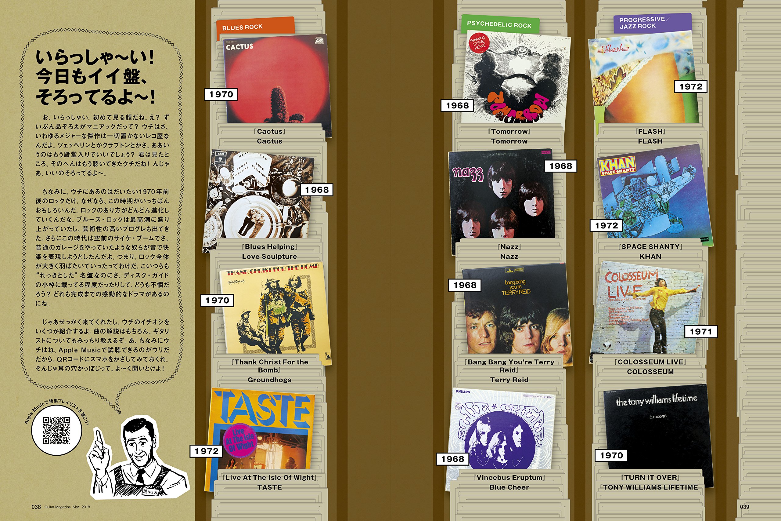 じゃあせっかく来てくれたし、ウチのイチオシをいくつか紹介するよ。曲の解説はもちろん、ギタリストについてもみっちり教えるぞ。あ、ちなみにウチはね、Apple Musicで試聴できるのがウリだだから。QRコードにスマホをかざしてみておくれ。そんじゃ耳の穴かっぽじって、よ〜く聞いとけよ!