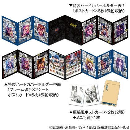※上記の商品内容に加え、複製原画(ミュージェットグラフ印刷(高品位インクジェット技術)/画寸B5/マットスタンド付)×1個をセットにした『北斗の拳』35周年記念特製Wフレーム切手&複製原画セットも販売価格(送料・消費税込)16,800円で販売します。