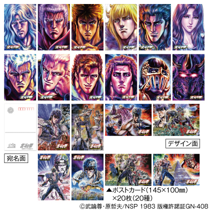 4月23日(月)からは東京中央郵便局にて「特製Wフレーム切手セット」や「直筆サイン入り純金ポストカード」の商品サンプルのほか、複製原画パネル、ケンシロウの等身大フィギュア、ラオウの顔出しパネルなどの展示が行われます。