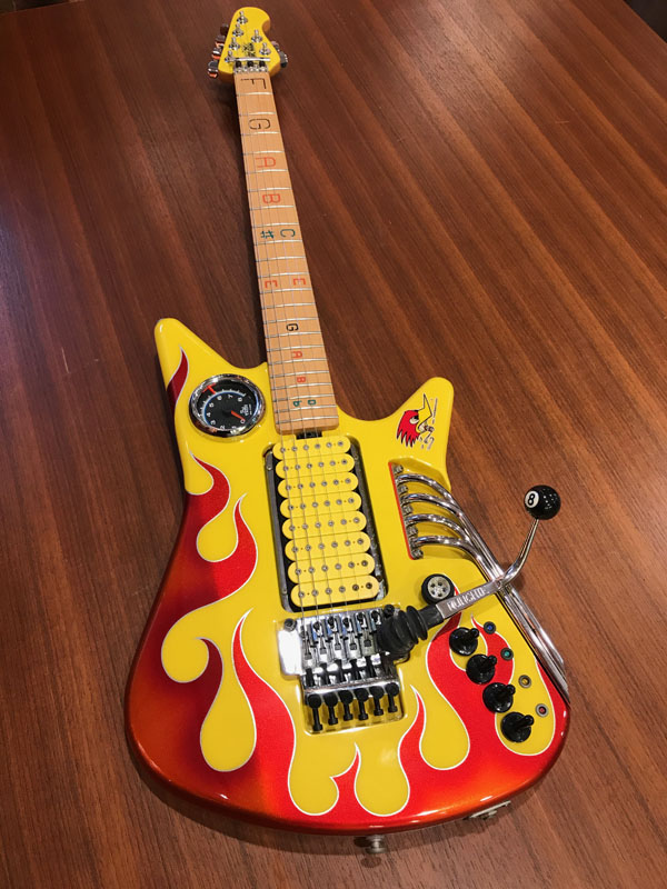 このたび、スパイナル・タップのギタリスト、ナイジェル・タフネルのシグネイチャー・モデルとして誕生したギターが5月26日より新宿武蔵野館にて一般公開されることが決定した!!そのギターとは、アーニーボール/ミュージックマンの"Mr. Horsepower"。1992年のスパイナル・タップのツアーの際にナイジェル・タフネルがアーニーボール/ミュージックマンに依頼したことによって生まれた。クローム・メッキのマフラー、ピックアップを4つ搭載した8コイル・ピックアップ配列、演奏中のアタック感を表示するタコメーター、そしてフロイドローズ・トレモロ・アームには、車のギアシフトをモチーフにした形状に、ブラック・エイト・ボールの"シフトノブ"が装着されており、まるでドロドロのV8サウンドが轟くアメ車とギターが合体したかのようなスペシャル・ギター。しかもすべてギターとして完全に機能する!ジェフ・ベックやライ・クーダーも試奏でうなったというこのギターを、同年のフレディ・マーキュリーの追悼コンサートでかき鳴らし、新曲「The Majesty of Rock」を熱唱するナイジェルの姿は映像にも残っておりとても有名だ。