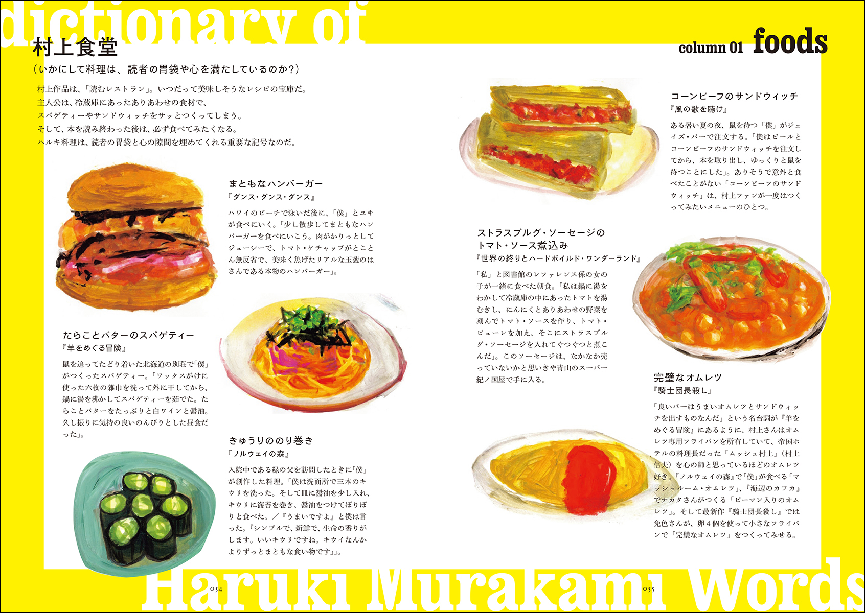 村上作品で印象的な、料理やカクテル、独特な比喩表現、外国語版の装丁など、さまざまな角度から楽しめるコラムも充実。