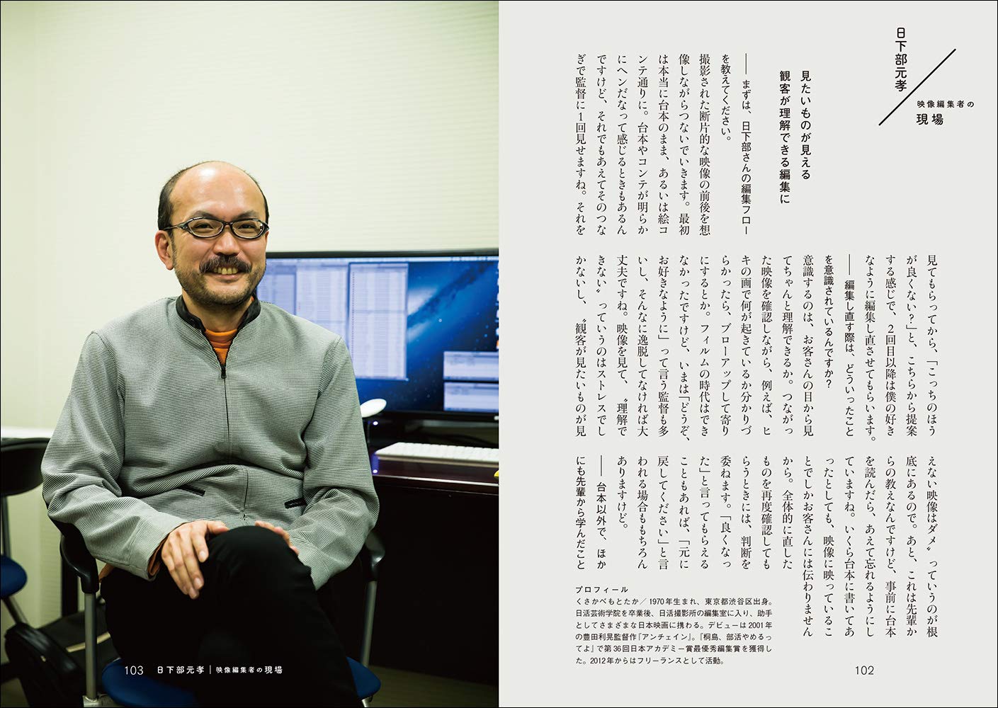 映画監督やカメラマンのインタビューは様々なメディアで目にするものの、映像編集者の声を見聞きする機会はあまりありません。本書はそんな現状から着想を得て、スタートした企画です。最近はWEB動画をはじめ、映像コンテンツが氾濫し、プロのみならずアマチュアを含め、様々な立ち位置の人々が映像編集を行なっています。手探りや感覚で編集する人々も多いなか、本職のプロはどのように撮影素材と向き合い、映像を紡ぎあげていくのか。本書では、第一線で活躍する話題の映画の映像編集者7人にインタビューを行いました。