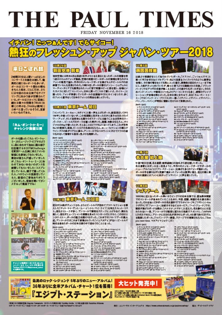 のニュー・アルバムにあわせスタートした、最新情報、トリビア、新作の聴きどころ等を掲載した『The Paul Times』。先日行われたジャパン・ツアー2018を特集した第8号が公開されています。PDFファイル。