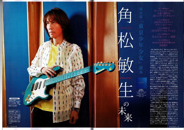 “角松敏生の未来”と題して、現在の角松が見出したミュージカルの世界などをたっぷりと語ってもらった超超超ロングインタビュー、ムーンギターズ山﨑等氏の発言も盛り込んだMOONシグネチャーギターストーリー、新導入されたシンセサイザー類も含む最新ギアレポート、そしてあんにゅ(コアラモード.)とのスペシャル対談、山本真央樹(DEZOLVE)のインタビューも盛り込んだ28頁に及ぶ大特集となる。ほぼ撮り下ろしの写真、ボリュームたっぷりのインタビューテキストを、『東京少年少女』を堪能しながらお楽しみいただきたい。