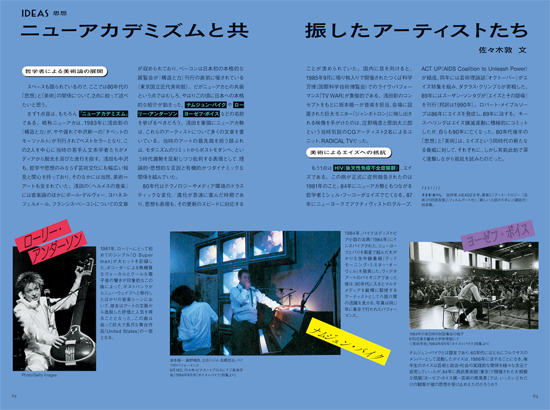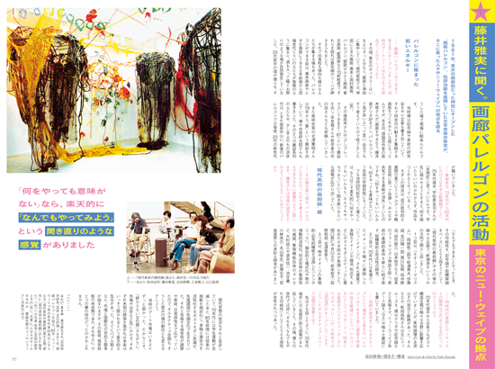 よみもの記事の合間にある、エイティーズ・カルチャーへのオマージュとして、金氏徹平+森千裕、大山エンリコイサムといったアーティストや、表紙デザインも手がけるSTEREO TENNISらによるビジュアルページも注目だ。最後は椹木野衣による長文論考も寄せられ、この1冊を読めば、80年代のアートシーンの総覧とディテールとの両方を同時につかみとることができる。