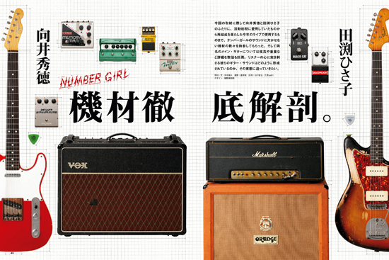 そんなナンバーガールのギターを担当するのは、向井秀徳と田渕ひさ子の両人。向井はテレキャスター、田渕はジャズマスターの当代きっての使い手です。このふたりが渾然一体となって生み出すギター・アンサンブル。それは、ナンバーガールが表現する世界の中核をなすものと言えます。殺気、懐かしさ、清涼感、はたまた可笑しささえも感じる独特のムード。あれは一体、どのようにして作り上げるのだろう? 解析不能とも言われる彼らのサウンドの秘密に、少しでも迫ってみたいーー。そこで本誌では、通常の音楽誌とは違う切り口で、"ナンバーガール・サウンドが持つ魅力"を紐解くことにしました。中尾憲太郎(b)とアヒト・イナザワ(d)のリズム・チームにも登場願い、130ページの大ボリュームで徹底的に掘り下げます。日本人アーティストでこれほどのボリュームを割くのは本誌の歴史を見てもほかにありません。