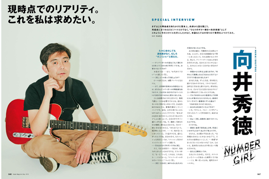 まずはこの再結成を持ちかけた張本人、向井が登場。再結成にまつわるエピソードだけでなく、"ひとりのギター弾き=向井秀徳"としてどのように今のスタイルを手にしたかなど、本誌ならではの切り口でお送りします。