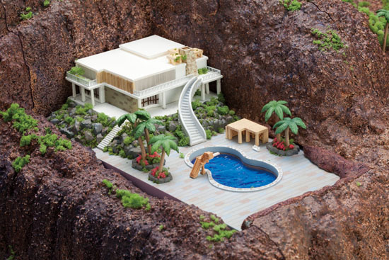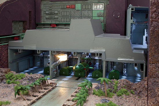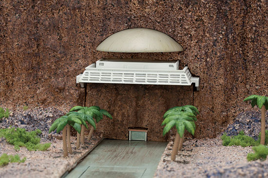 岩山然とした島の外観をはじめ、点在する建造物とそのインテリア、照明、プール、滑走路、プラントなどを丁寧につくりこみます。地下に広がる基地は1〜5号機まで発進基地ごとに5分割されており、それぞれの地表部分を外すと救助メカや格納庫などの内部施設が出現する仕組みになっています。