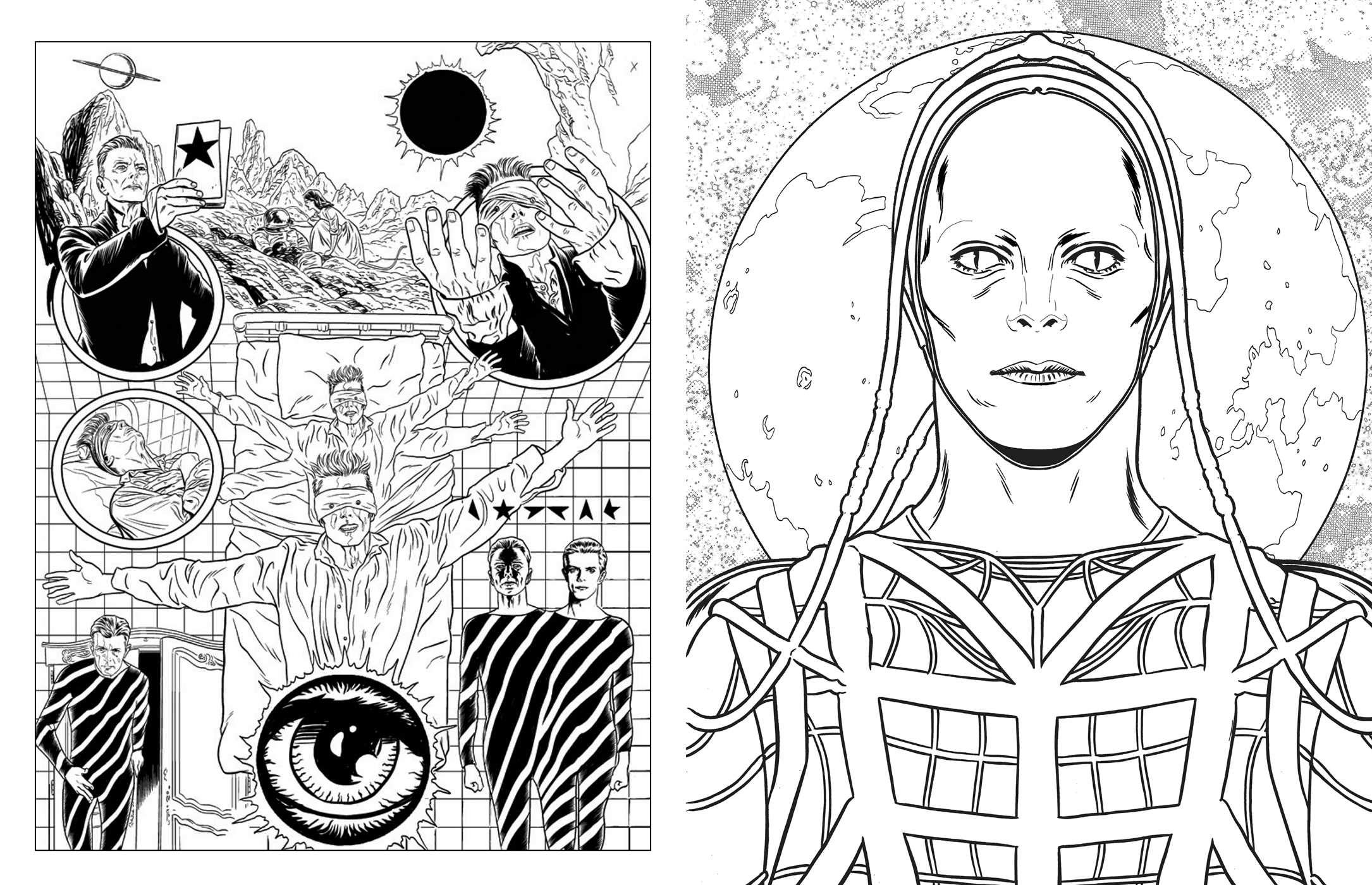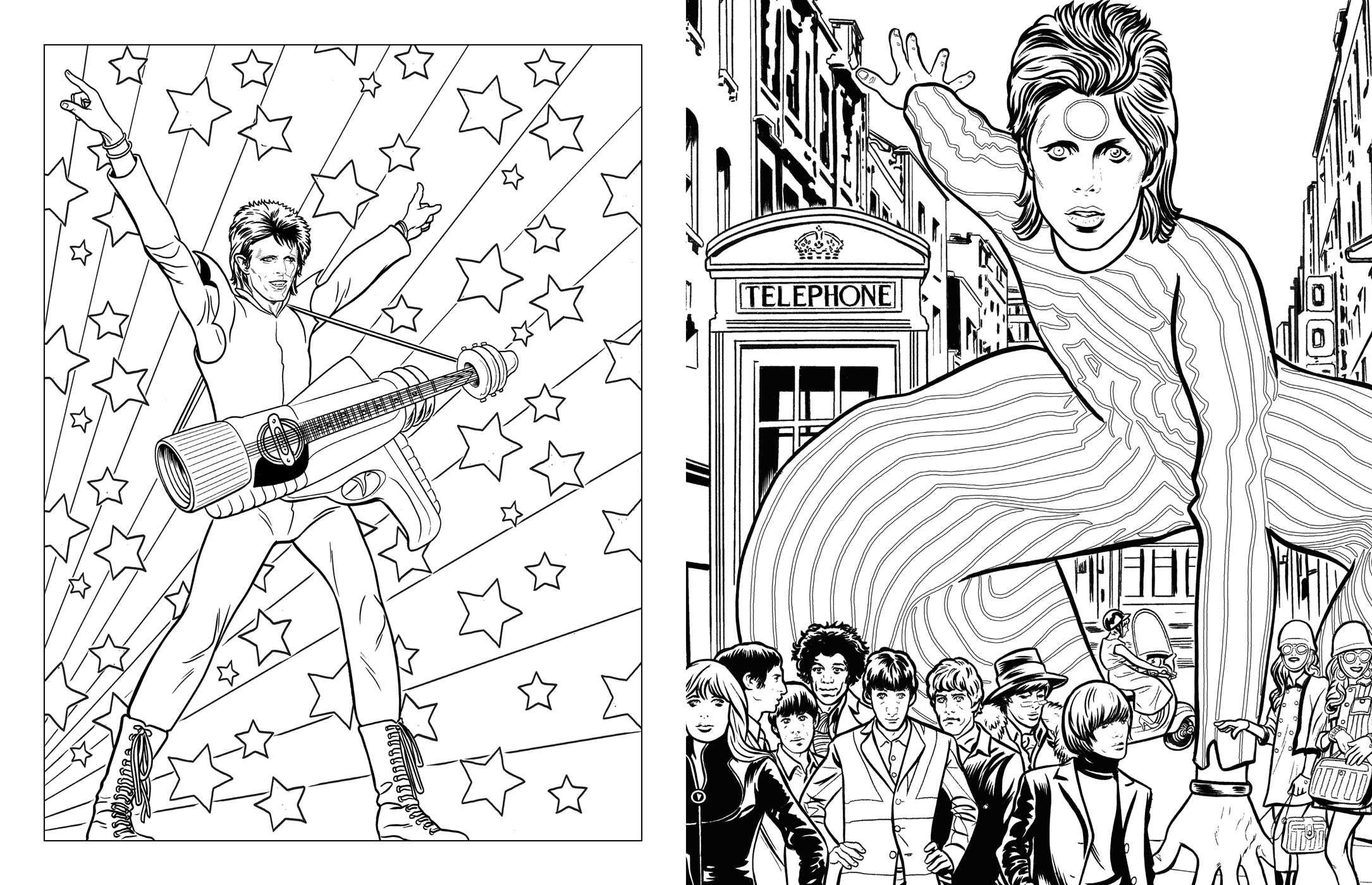 受賞歴のあるアーティスト、マイケル・オールレッドによるボウイのグラフィックノベル『Bowie: Stardust, Rayguns & Moonage Daydreams』から生まれた塗り絵本で、グラフィックノベルの人気シーンに自分の好きな色を付けることができます。