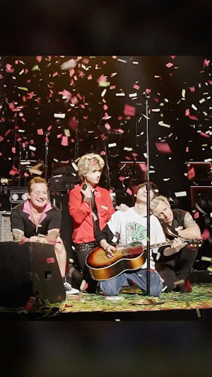 グリーン・デイ(Green Day)は2月末に行った横浜公演のオフィシャル・ライヴ映像をSNSにて公開。最後の曲「Good Riddance (Time of Your Life)」の映像で、この曲のギターを弾けるということでステージに招かれた若い男性ファンの演奏にあわせてビリー・ジョー・アームストロング(Billie Joe Armstrong)が歌い、曲の後半ではメンバー3人が男性ファンのまわりに集まり、パフォーマンスを締めくくる様子が映されています。