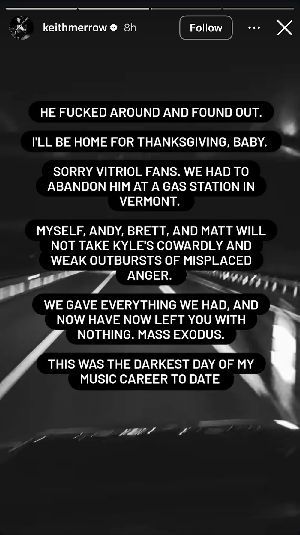 この騒動があったのはテクニカルデスメタルバンドのヴィトリオール(Vitriol)。ギタリストのキース・メロウが自身のInstagramのストーリーでこのニュースを共有。バンドは北米ツアー中でしたが、自身とベーシストのブレット・ライアー、ドラマーのアンディ・ヴィンチェンゼッティが、バンドの創設者でありフロントマン兼ギタリストのカイル・ラスムセンをバーモント州のガソリンスタンドに置き去りにしたと説明しています。