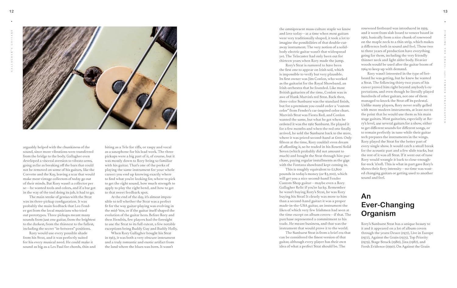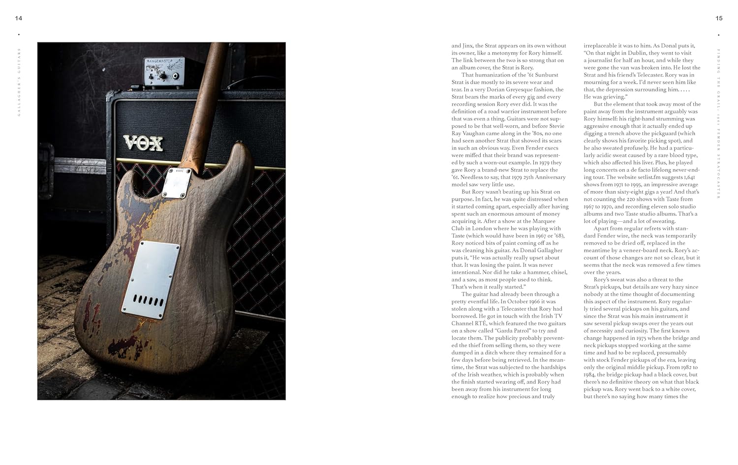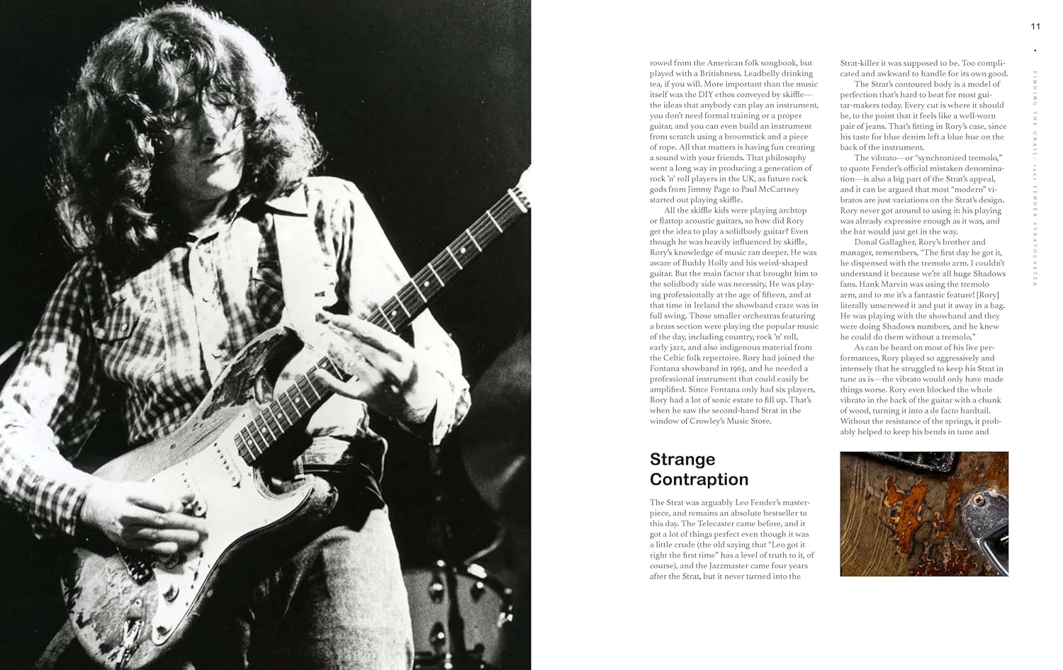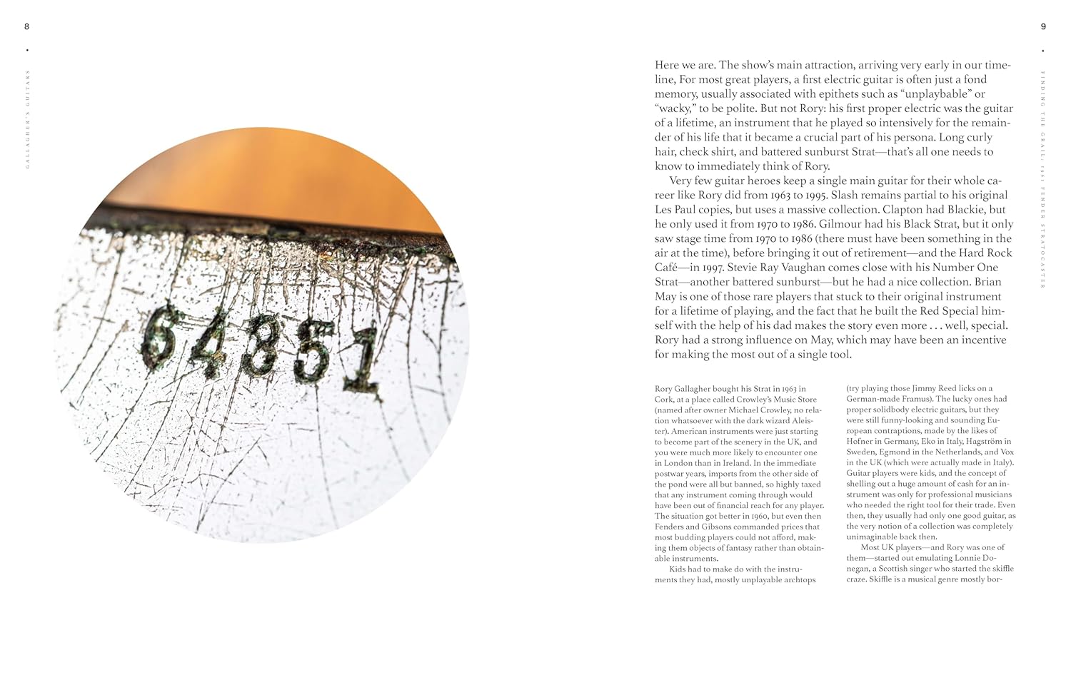 ギター写真家エレノア・ジェーンによる楽器写真には、ギター歴史家のジュリアン・ビトゥーンの解説が添えられ、ロリーの弟で元マネージャーのドナル・ギャラガーへのインタビューや、ギャラガー家が提供するアーカイブ写真も掲載されています。