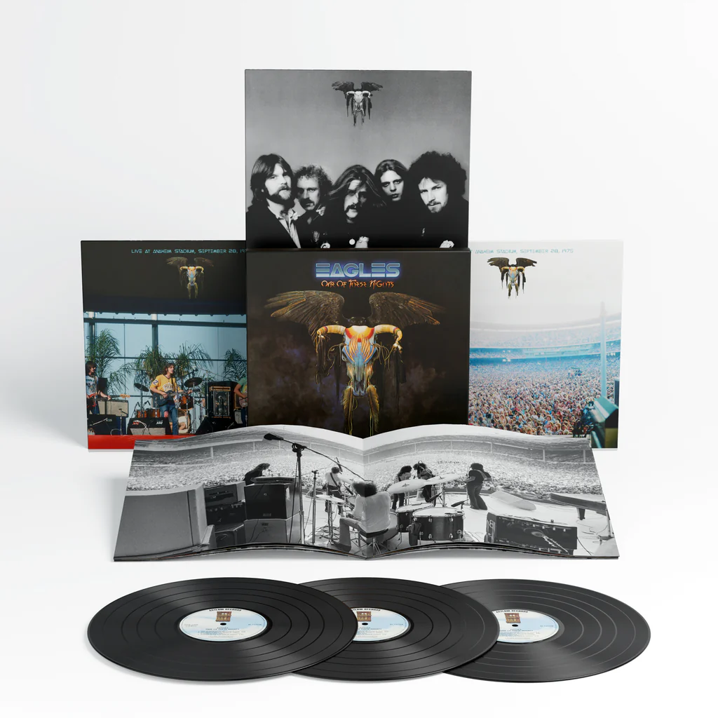 いずれも『One of These Night』の2025年版ミックスに加え、1975年9月28日にアナハイムスタジアムで録音されたこれまで未発表のフル・ライヴ音源を、3枚のCDおよびアナログレコードに収録。ライヴ盤に収録されるこの公演には、数か月後に正式メンバーとなるジョー・ウォルシュがゲスト出演しています。