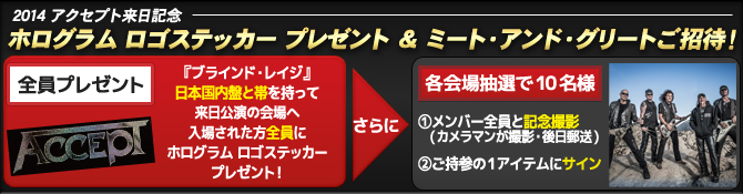 8月に発売される最新アルバム『Blind Rage』の日本盤CDと付属の帯を持って来日公演の会場に特設されたブースへと行くと全員にホログラム ロゴステッカーがプレゼントされ、さらに当日の公演終了後に実施されるミート&グリートへの参加券が各会場抽選で5名にプレゼントされます。ミート&グリートではメンバー全員との記念撮影、そして持参したアイテム1点にサインがもらえる予定。