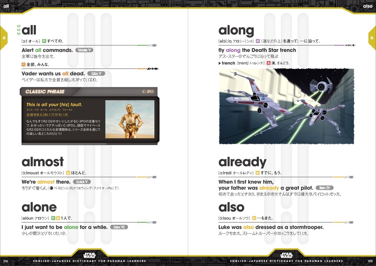 本書では、劇中のせりふや作品のスクリプト(旧3部作)に登場する中学レベルの基本英単語を中心に約1,000語を例文つきで収録。囲み記事「FORCE PHRASE」や「CLASSIC PHRASE」では、ファンならぜひ暗唱できるようにしておきたい名言を楽しむことができます。