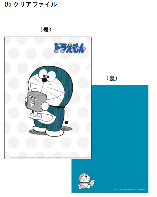 漫画「ドラえもん」の誕生45周年を記念したフレーム切手セットで、フレーム切手、B5 クリアファイルは、手紙や切手にまつわる原作イラストを使用した郵便局ならではのデザインになっています。また、原作の味わいあふれるオリジナルフィギュアも付属されます。