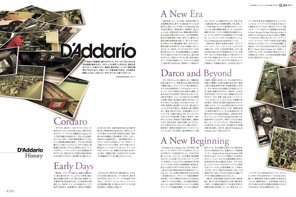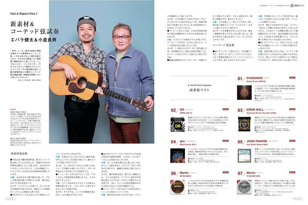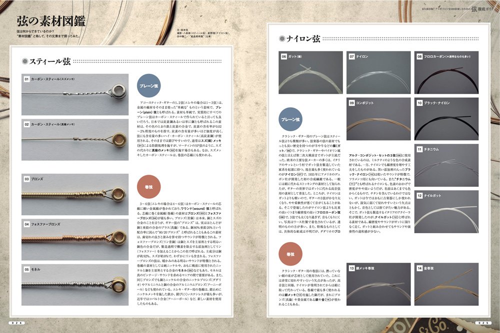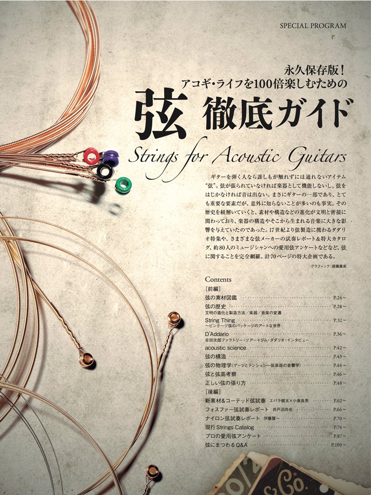 これまで好評を博した“木材”“ピック&ネイル”“インレイ”に続く、まるごと1冊規模の保存版/徹底ガイド企画の第4弾は“弦”に焦点を当てる。ギターを弾く人なら誰しもが触れずには通れないアイテム“弦”。弦が張られていなければ楽器として機能しないし、弦をはじかなければ音は出ない。まさにギターの一部であり、とても重要な要素だが、意外に知らないことが多いのも事実。その歴史を紐解いていくと、素材や構造などの進化が文明と密接に関わっており、楽器の構造やそこから生まれる音楽に大きな影響を与えていたのであった。17世紀より弦製造に携わるダダリオ特集や、さまざまな弦メーカーの試奏レポート&特大カタログ、85人のミュージシャンへの愛用弦アンケートなどなど、弦に関することを完全網羅。計70ページの特大企画である。