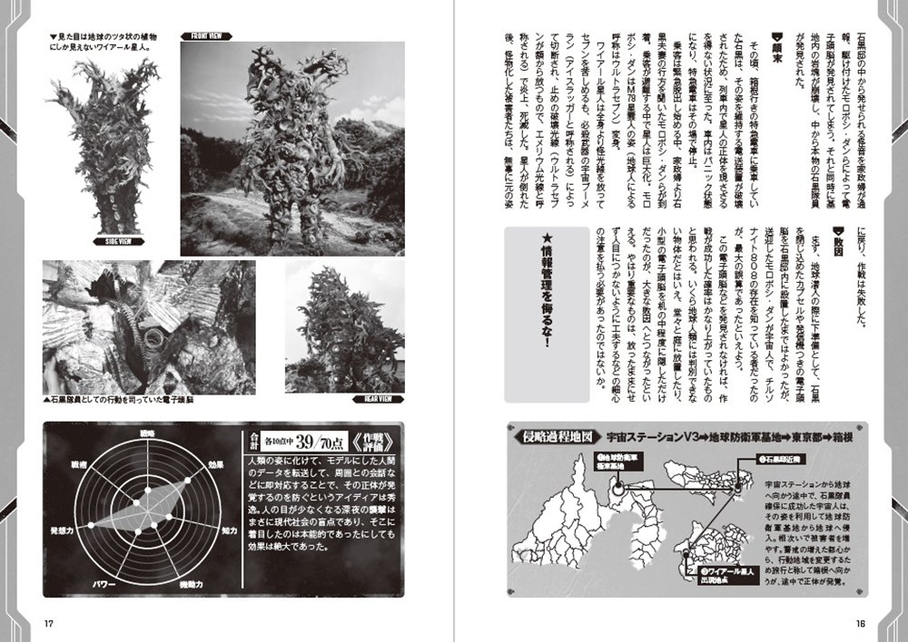 合計45の侵略計画について、侵略者ごとの侵略計画と実行された作戦の経緯や結果を考察し、侵略した星人、円盤、怪獣の図や侵略経路の地図、ポイント化した侵略計画のランキングなどを駆使して、多面的に語ります。