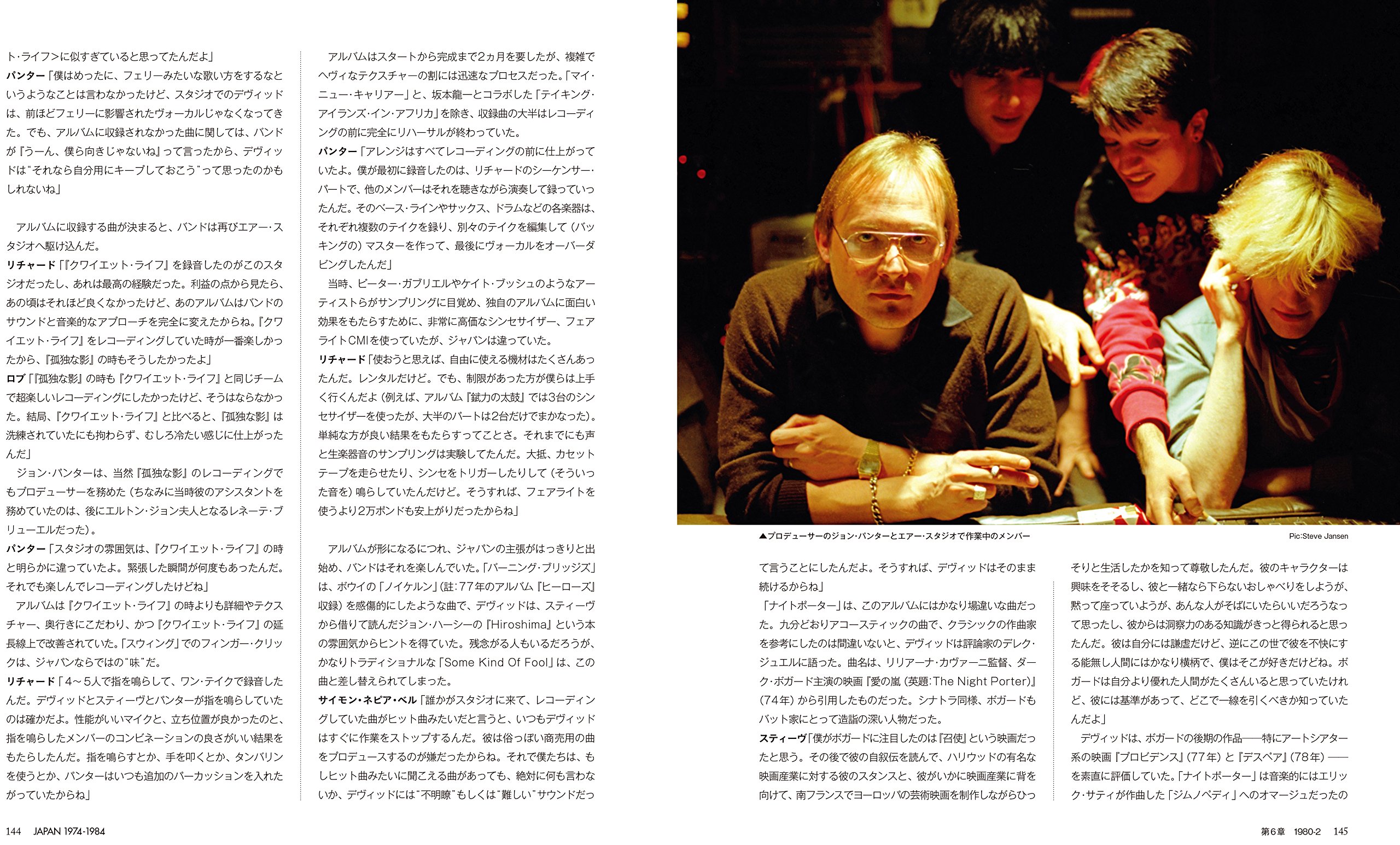 デヴィッド・シルヴィアンがミック・カーンの恋人を略奪してバンド間に亀裂が生まれたこと、ロブ・ディーン本人が語る脱退の真相、スティーヴ・ジャンセンの日記に記された『錻力の太鼓』レコーディング中のエピソードなど、今まで明かされたことがなかったバンドの真実がヴェールを脱ぎます。ミュージック・ライフ時代のインタビューや秘蔵写真も多数収録の日本特別仕様で発売。70年代末〜80年代初頭を鮮やかに駆け抜けていったジャパンを総括するファン必携の一冊です。