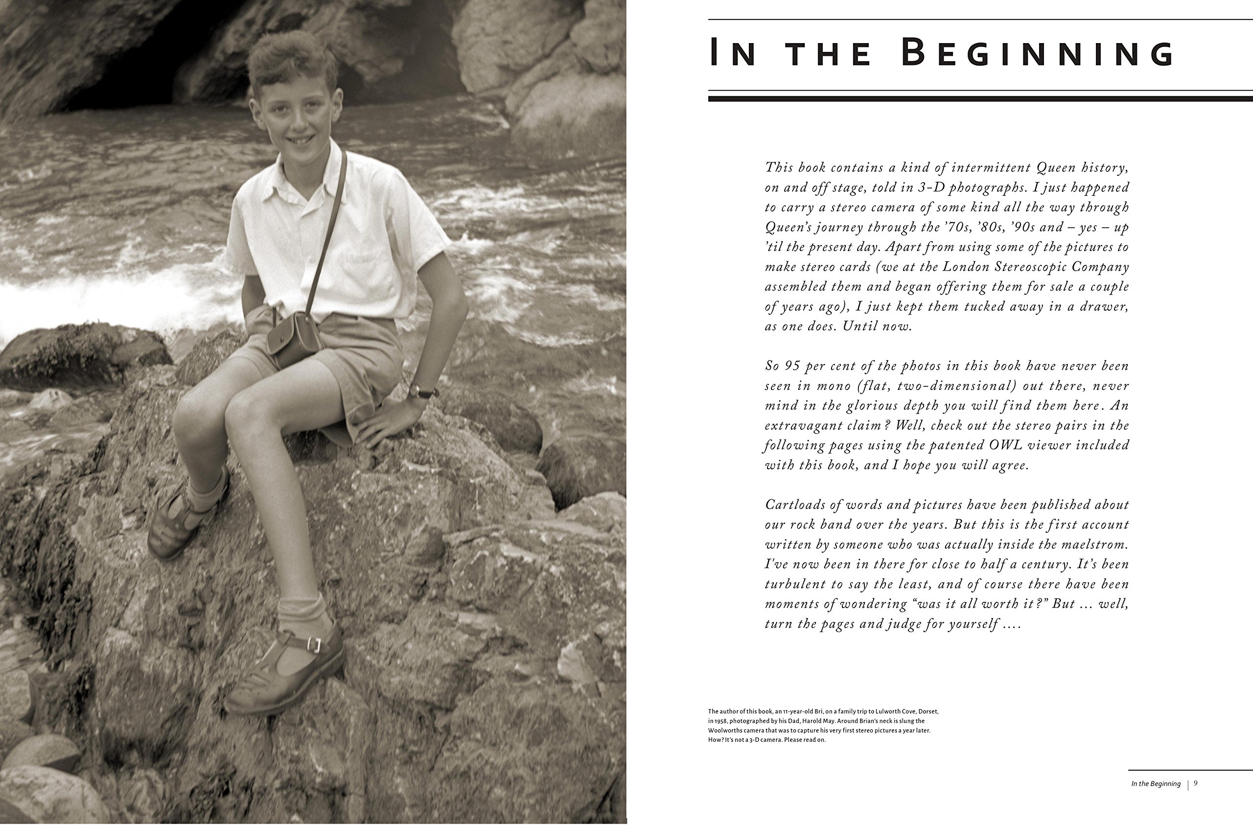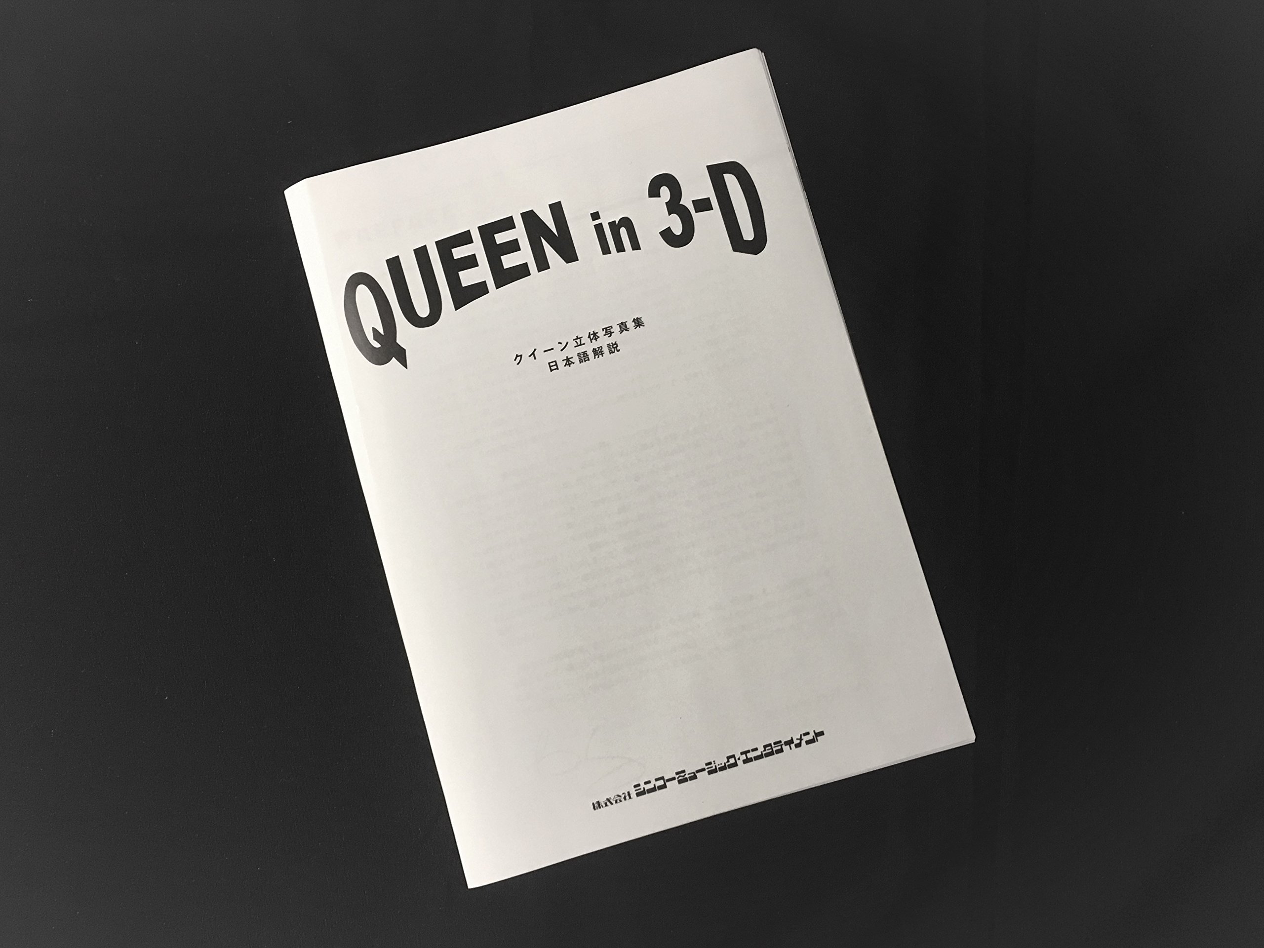 『QUEEN in 3-D』は、ブライアン・メイの著・監修によって完成した写真集です。写真集には、OWL(オウル)と呼ばれる専用ゴーグルがセットされています。こちらのゴーグルを使って写真集に掲載された3-D写真をみることによって簡単に立体画像を楽しむことができます。 写真集にはブライアンが幼少の頃からの趣味として楽しんでいた3-D写真300点以上を掲載、さらにブライアン自身がクイーンでの活動やプライベートライフに関しての思い出を書き下ろしています。 3-D写真は、ツアー中のオフステージやライブの様子、幼少時代の写真などが掲載され、そのほとんどが未発表のものです。特に日本公演に関しては多くのページがさかれています。 『QUEEN in 3-D』には、1973年にリリースしたファースト・アルバムのジャケットに隠されたエピソードから、初のアメリカツアー、何度も訪れた日本での思い出、南米でのスタジアム・コンサート、さらにメンバー間で撮影されたオフステージでのプライベート・ショット、そして、アダム・ランバートを加えての最新ツアーの様子まで、クイーンの歴史とともに撮影された数多くの3-D写真とブライアン自らが執筆したテキストで構成されています。特に3-D写真の数々は、専用ゴーグルを通して見ると、そのリアルな立体感に大きな驚きをおぼえることは間違いありません。またステレオ写真以外にも、メンバー同士で撮影したと思われる多くの非公開オフショットがフルサイズで掲載されています。