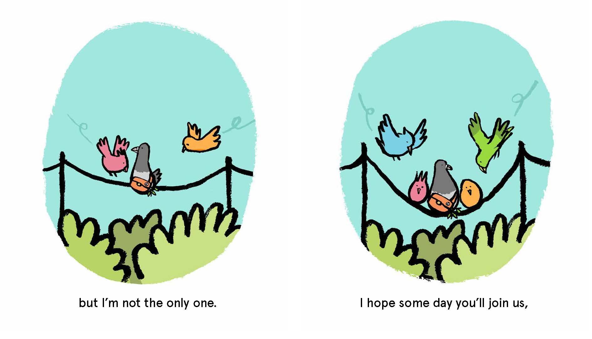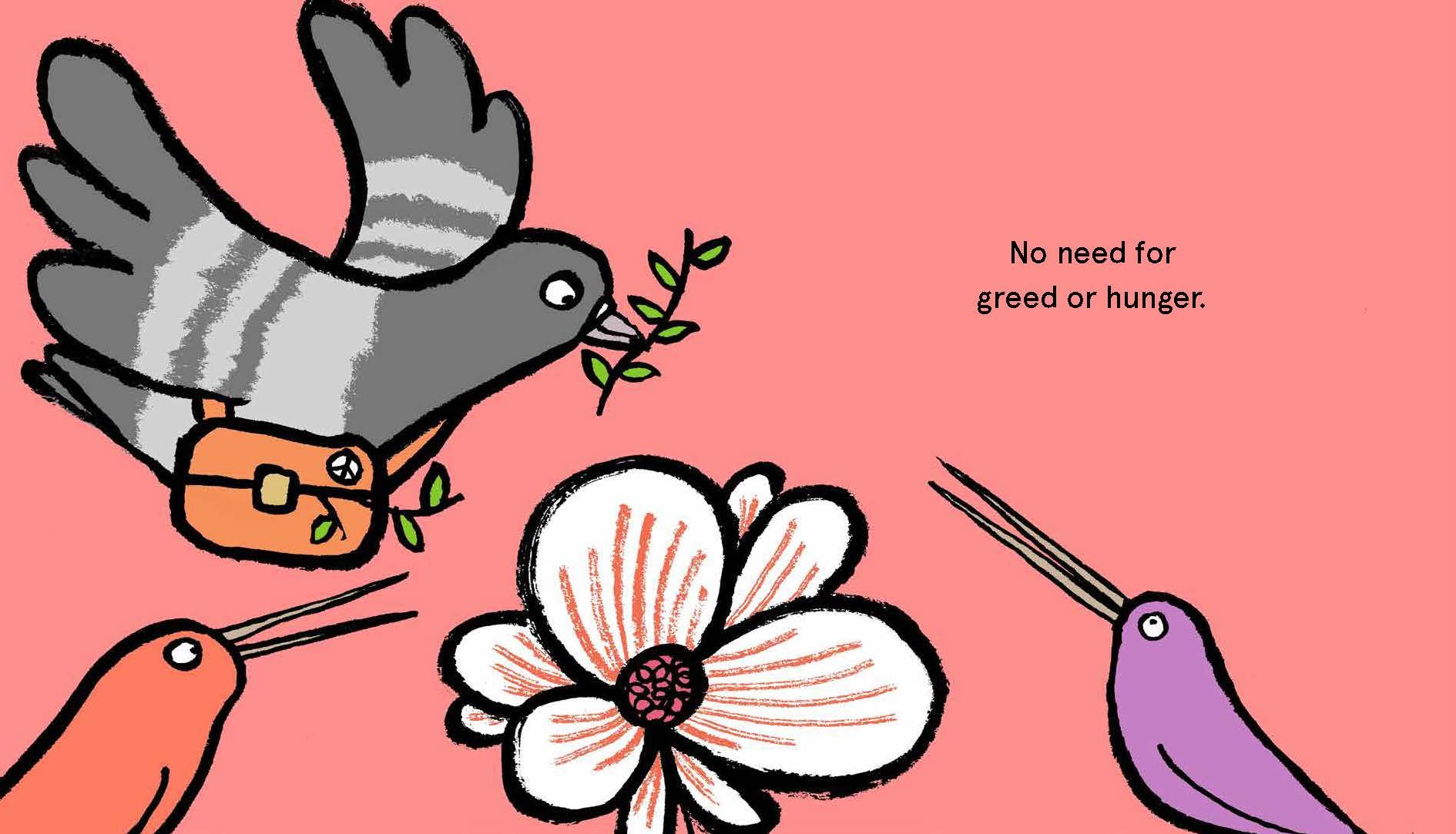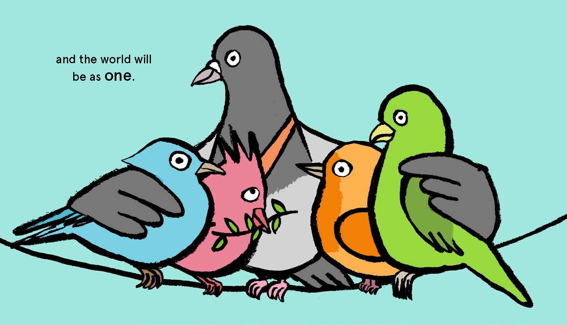 この絵本はロンドン在住のフランス人グラフィックデザイナー、ジャン・ジュリアンがイラストを担当。内容は「1羽の鳩が一生懸命に伝えまわっているもの。それは国を越えた平和と友愛でした」。