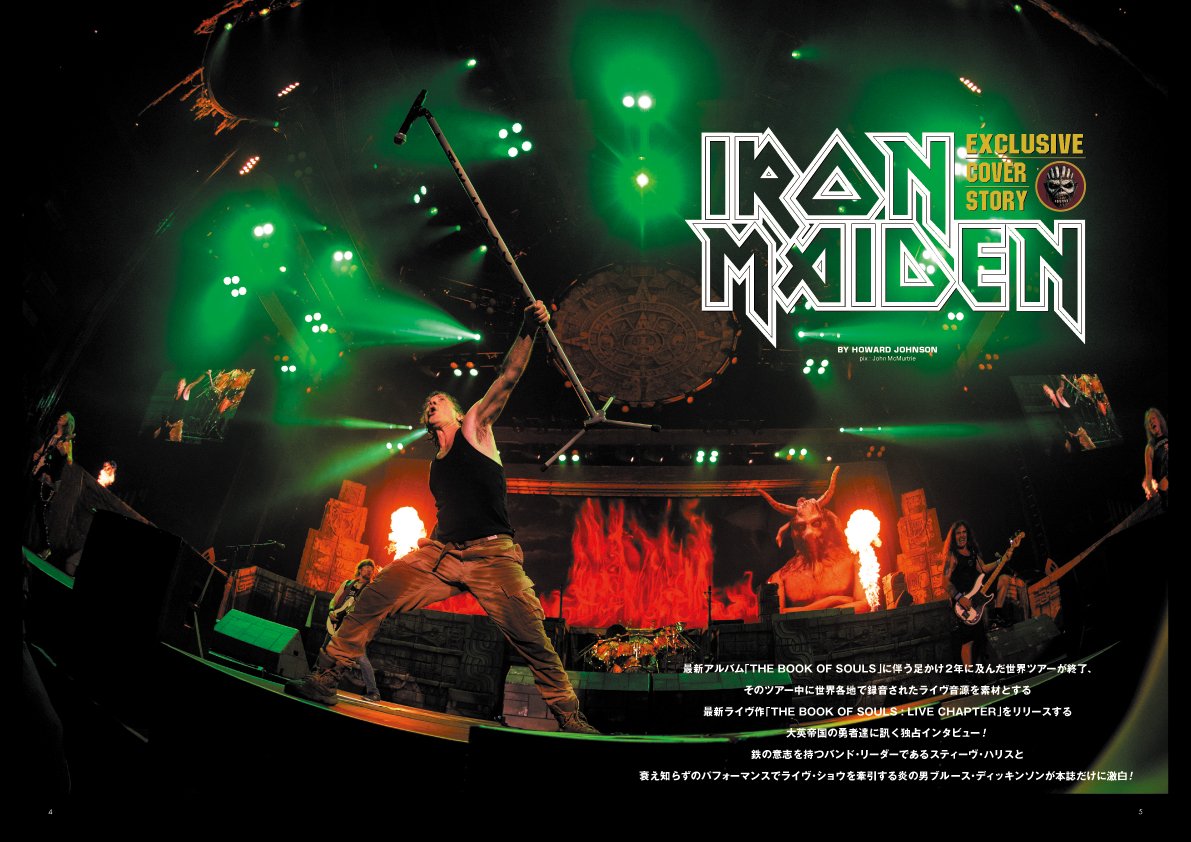 ■巻頭特集:最新ライヴ作『THE BOOK OF SOULS : LIVE CHAPTER』をリリースする大英帝国の勇者アイアン・メイデンに独占インタビュー。鉄の意思を持つバンド・リーダー/スティーヴ・ハリスと、ライヴ・ショウを牽引する炎の男ブルース・ディッキンソンが本誌だけに独白!+ライヴ作品で振り返るアイアン・メイデン・ヒストリー ■海外ライヴ・リポート:アーチ・エネミー、スコーピオンズ+メガデス ■独占会見:トニー・アイオミ、ヨーロッパ、トリヴィアム、サイラ、サンタ・クルーズ他 ■来日取材:MR.BIG、アクセプト、クリーター & ヴェイダー、ナイト・レンジャー他 ・再開限定企画:『PUMPKINS UNITED』来日カウントダウン!! ④ ・特別連載『TALES FROM THE FRONTLINE』③ アンスラックス ・特別企画:私の好きなアイアン・メイデン・ベスト5曲』★ミュージシャン編 ★編集部・ライター編 ◎ポスター:マイケル・シェンカー ★ALDIOUSスペシャル・サンプラーCD付!