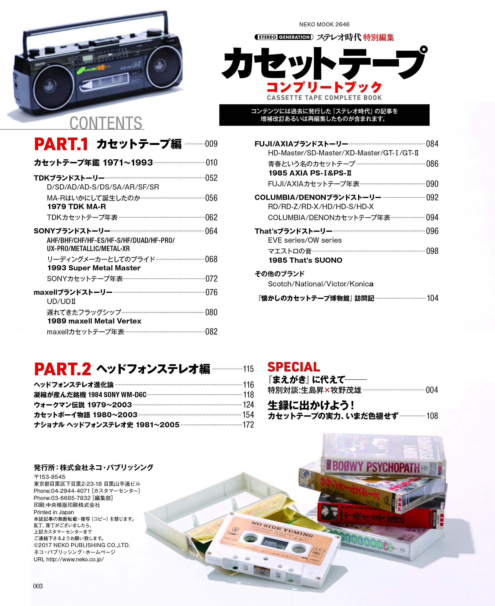 そのほかカセットテープ関連企画満載でお届けする、思い出に浸れる1冊であり、ネットオークションでの売買時に役立つ1冊でもあります。