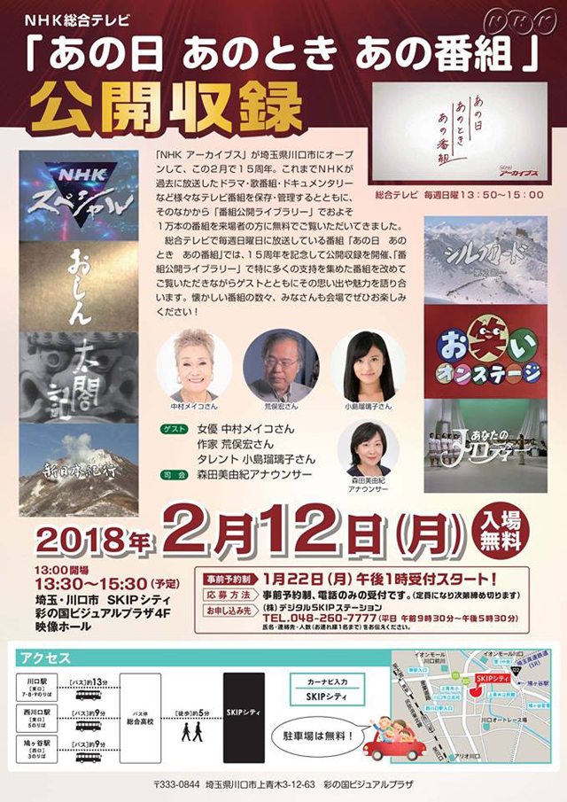NHKが過去に放送した様々なテレビ番組を保存するとともに、その中から約1万本の番組を来場者に無料で公開している埼玉の『NHKアーカイブス』。オープン15周年を記念して来場者に特に人気の高かった番組を映画館で上映するイベント(番組の公開収録)が開催決定 http://amass.jp/100553/